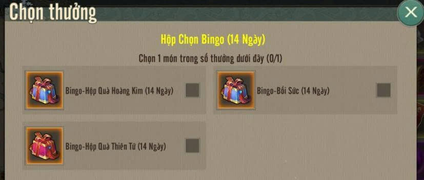 - Khi đã mở hết toàn bộ 25 ô số, người chơi được nhận phần thưởng cuối. Có thể chọn nhận miễn phí với phần thưởng cơ bản hoặc tiêu phí 1500 Ngân Phiếu để nhận thưởng đặc biệt như Hộp Chọn Hoàng Kim Đồ Phổ, Thiên Tứ Đồ Phổ, Hộp Nguyên Liệu Bối Sức (14 ngày)...