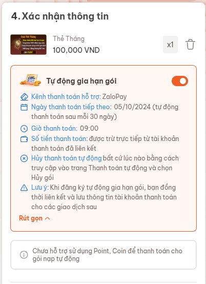 - Gói Thẻ Tháng: Tự động gia hạn sau 30 ngày