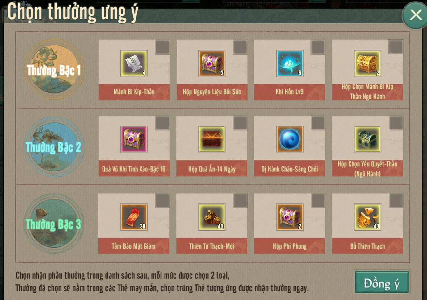 | Quà thưởng Bậc 1 | 3 Mảnh Bí Kíp Thần |