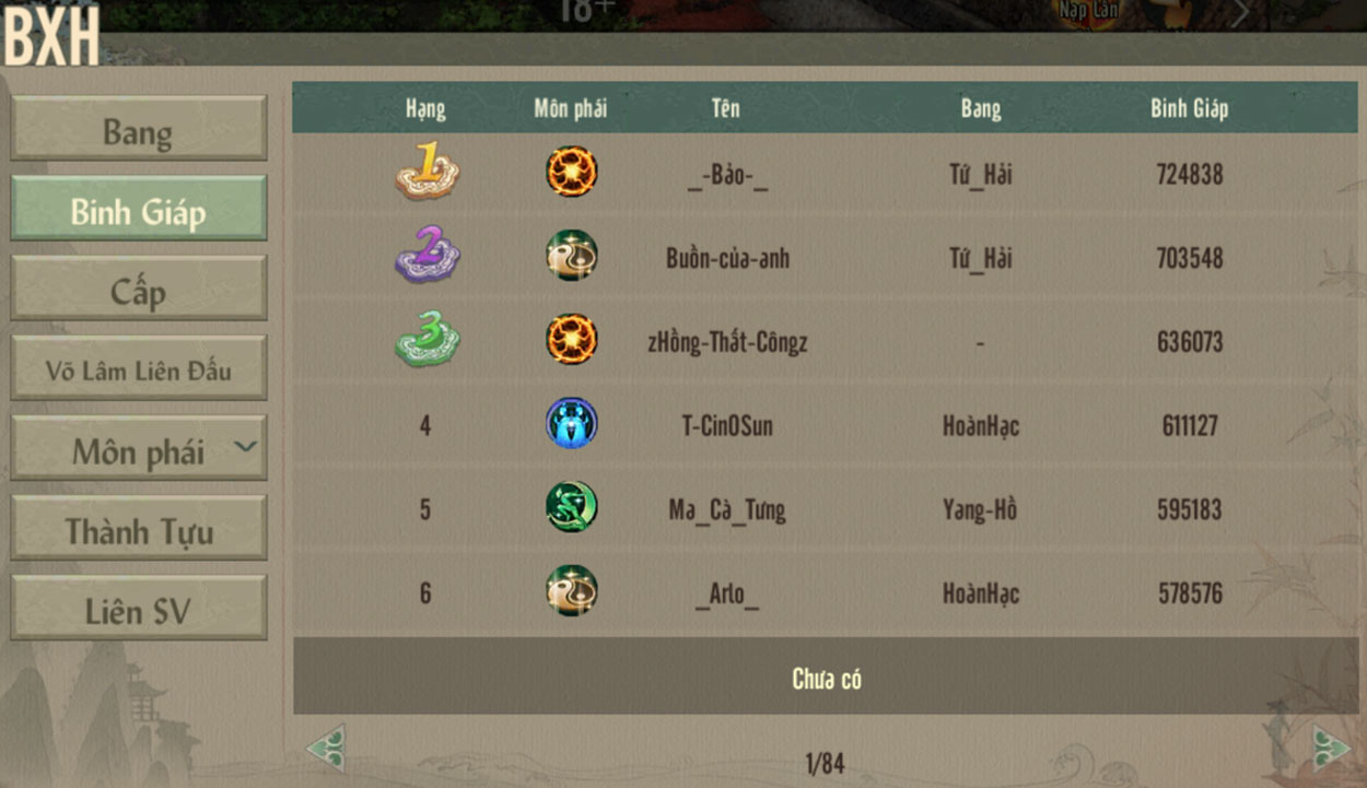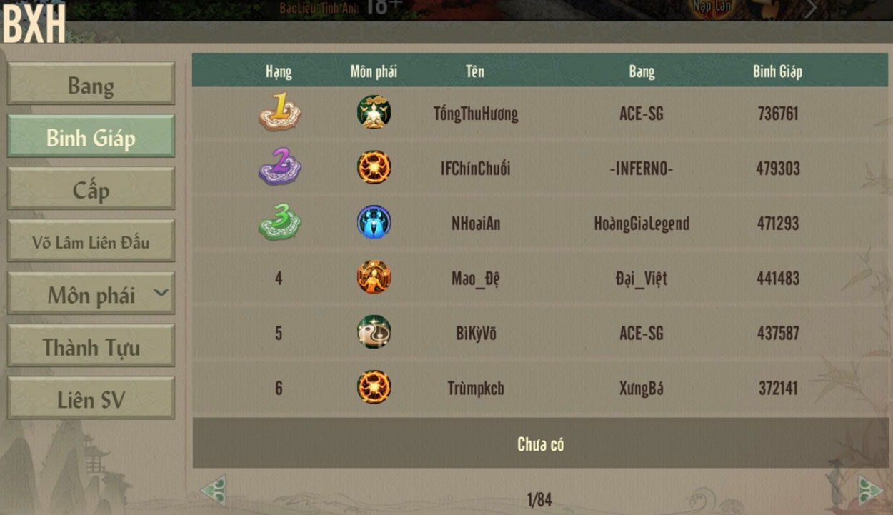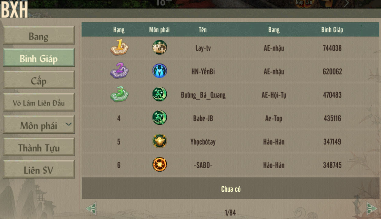 - Danh sách 20 đại hiệp Top 1 & 2 Binh Giáp từng Môn Phái toàn server: