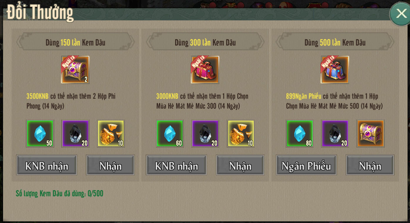 - Sử dụng Kem Dâu Tây đạt mốc nhất định có thể đến NPC Long Nhi ở Tương Dương để nhận thưởng mốc, có thể tiêu hao KNB hoặc Ngân Phiếu để nhận thêm thưởng mốc giá trị như Hộp Phi Phong, Mảnh Bí Kíp-Thần, Hộp Nguyên Liệu Bối Sức...
